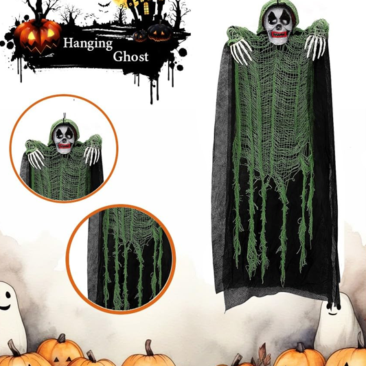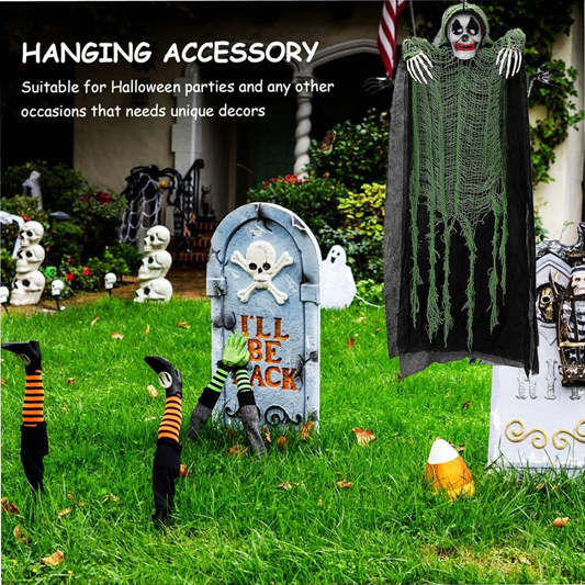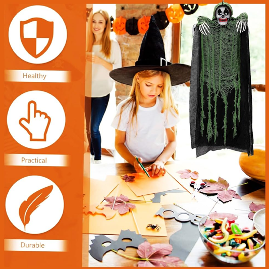 - 👻 Creepy Hanging Skeleton Décor – Features a spooky skull face with bony hands draped in a tattered green mesh cloak for an eerie haunted-house effect.